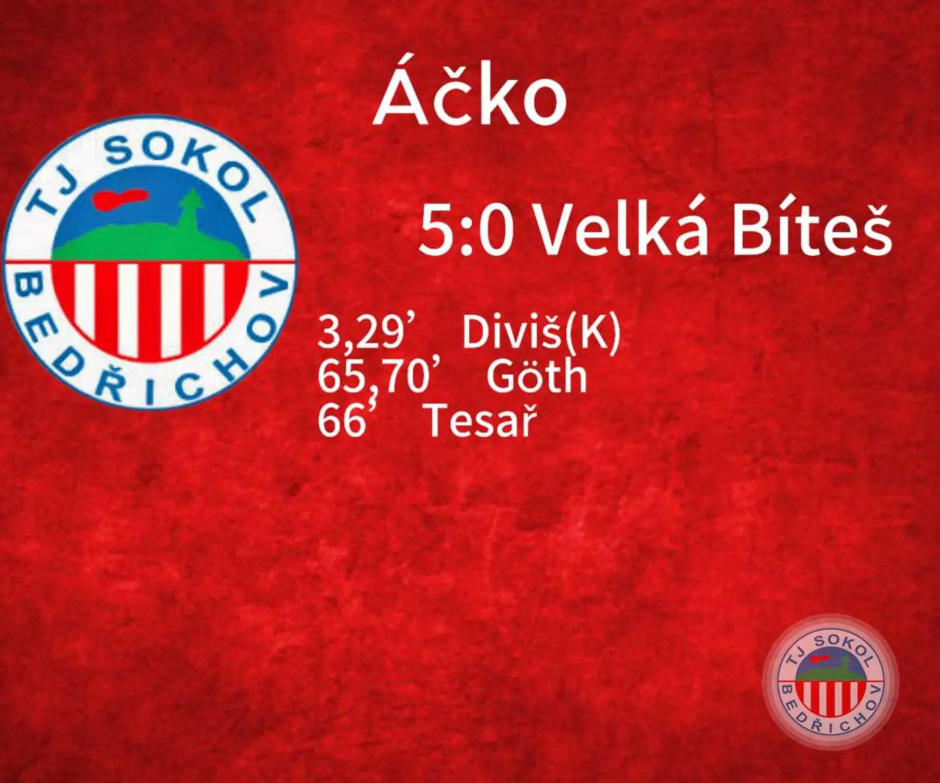 První tým Bedřichova potvrdil skvělou formu a doma si bez větších problémů poradil s Velkou Bíteší. Od prvních minut bylo jasné, kdo bude diktovat tempo. Dvakrát se trefil kapitán Lukáš Diviš, dvěma góly ho doplnil Jakub Goth a skóre uzavřel Dan Tesař. Výsledek 5:0 zcela vystihuje průběh zápasu a posouvá Bedřichov v tabulce o další krok výš.