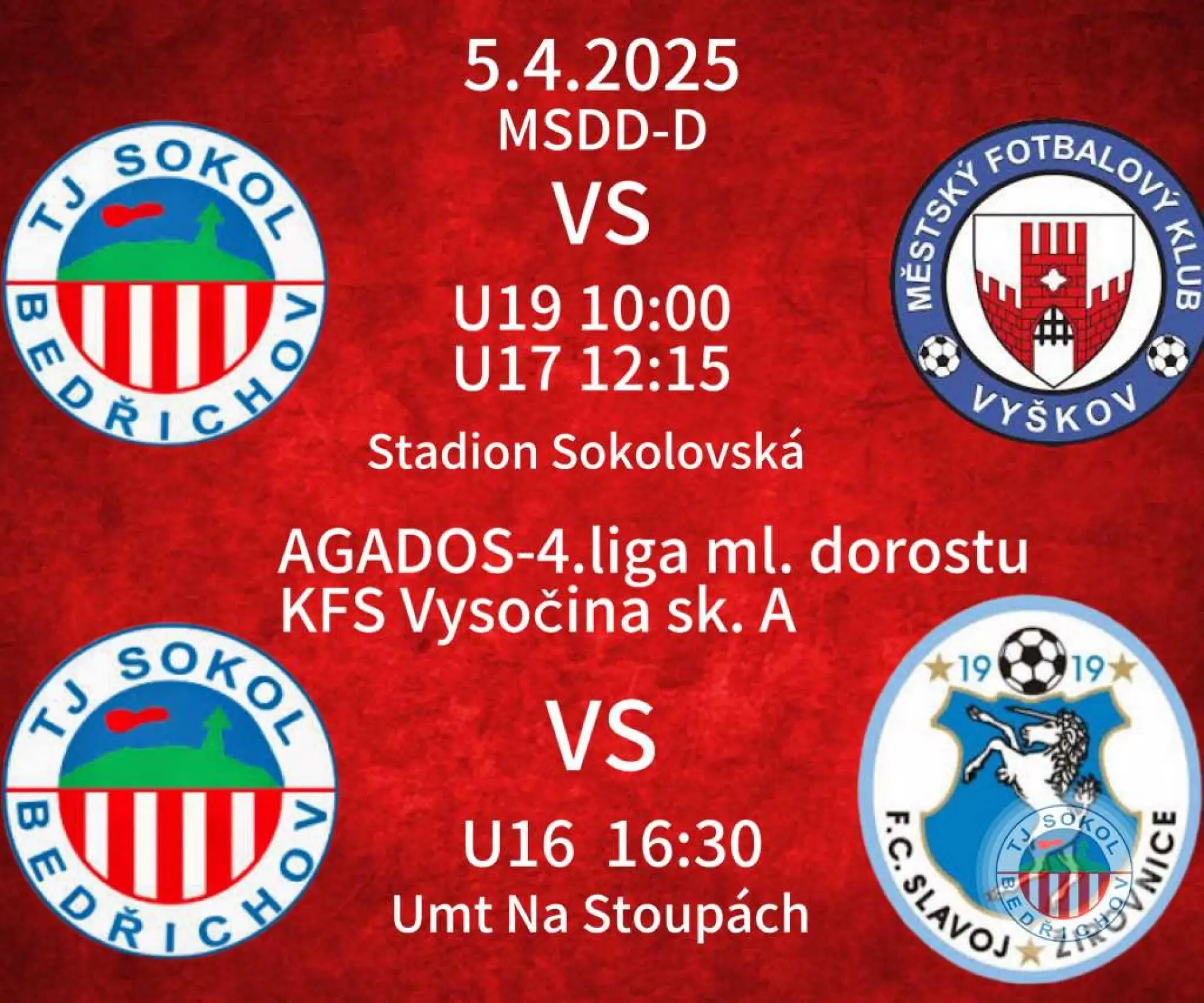 V rámci 20. Kola Moravskoslezské divize D vyzvou týmy u19 a u17 soupeře z Vyškova. Zápas staršího dorostu začíná v sobotu v 10:00. Zápas jejich mladších kolegů je naplánován na 12.15. Oba zápasy se odehrají na našem svatostánku v Sokolovské ulici.